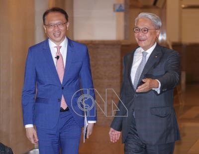 工商協進會理事長吳東亮(右)、宏碁董事長陳俊聖(左),17日下午在台北國際會議中心出席工商協進會公亮紀念講座,一同步入會場。