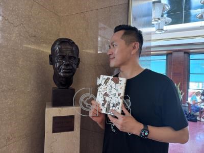 台灣作家陳思宏出席中歐文學盛事「作家閱讀月」,在咖啡廳與捷克首位總統哈維爾的雕像合照。