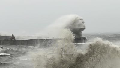 颱風凱米逐漸脫離台灣,受到環流影響台東地區25日清晨風強雨大,巨浪打在富岡漁港防波堤,激起陣陣浪花。
