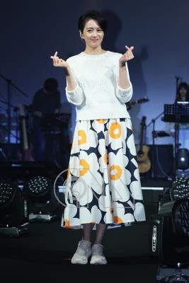 香港歌手梁詠琪26日晚間將在華山文創園區舉辦「時間遇上我們 專屬的特別」演唱會,下午舉行彩排記者會,梁詠琪向媒體比愛心致意。