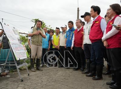 總統賴清德(前右2)27日在屏東縣長周春米(前右1)等人陪同下,到九如鄉一處農田視察茄子農損情況,聽取屏東縣農業處長鄭永裕(左2)簡報。