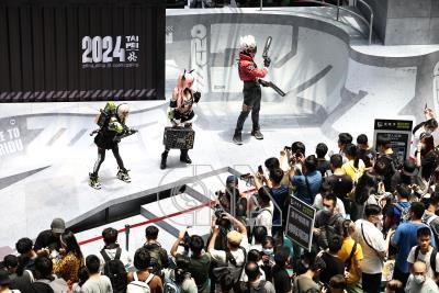 2024年第23屆漫畫博覽會持續在台北世貿1館舉行,參展攤位28日舉辦活動,許多cosplayer打扮成動漫角色,提供拍照並與粉絲互動。