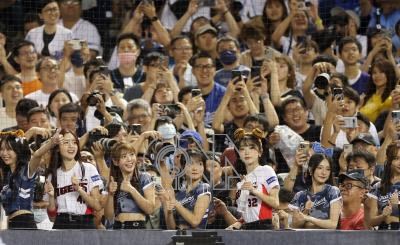 中華職棒富邦悍將28日在台北大巨蛋擔任主場球隊,韓國職棒起亞虎啦啦隊KIA TIGERS CHEERLEADER(白衣)、悍將啦啦隊Fubon Angels(藍衣)一同應援,吸引大批球迷到場。