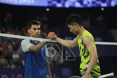 台灣羽球一哥周天成(右)連續3屆搶進奧運男單8強,法國時間2日力拚晉級,可惜最終遭印度選手森恩(Lakshya Sen)(左)擊敗。周天成賽後表示,很想幫大家完成奪牌目標,很遺憾沒能做到。圖為賽後周天成在網前與森恩致意,神情難掩失落。