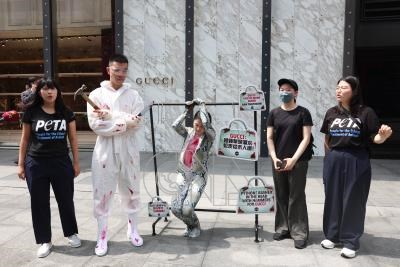 亞洲善待動物組織(PETA Asia)6日在時尚品牌Gucci新光三越信義店外上演行動劇,表演屠宰場工人以不人道的方式對待動物,並喊口號呼籲消費者以行動抵制購買。