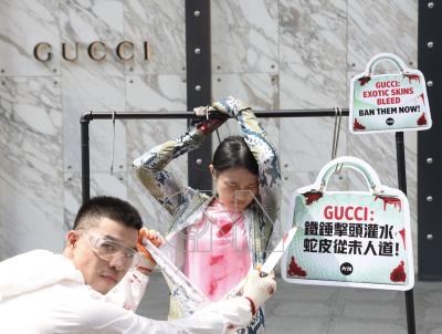 亞洲善待動物組織(PETA Asia)6日下午在Gucci新光三越台北信義A4館外上演行動劇,指在精品品牌Gucci母公司開雲集團(Kering)關聯的泰國蟒蛇養殖場發現,員工以不人道的方式對待被飼養的蟒蛇,養殖場出產的蛇皮用於製作品牌各類皮革製品。