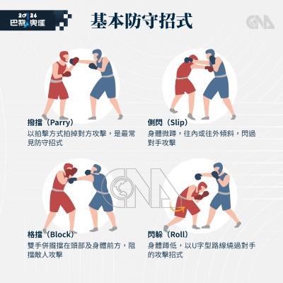 拳擊比賽中,拳手會根據對手進攻方式採用不同的防守策略,常見防守招式有撥擋、格擋、閃躲等。中央社製圖 113年8月8日