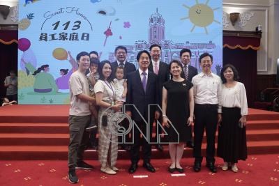 總統賴清德(前右4)15日在總統府主持「113年總統府暨國家安全會議員工家庭日」,副總統蕭美琴(前右3)、國安會秘書長吳釗燮(後右2)、總統府秘書長潘孟安(後右3)與副秘書長張惇涵(後右1)陪同出席,與員工家屬合影。