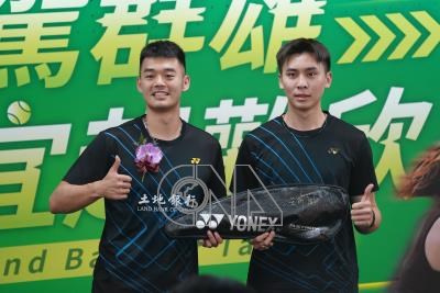 土地銀行15日舉行奧運選手表揚大會,同樣受到土銀贊助的羽球選手邱相榤(右)也到場祝賀。他即將與奧運羽球國手王齊麟(左)搭檔成男子雙打組合。