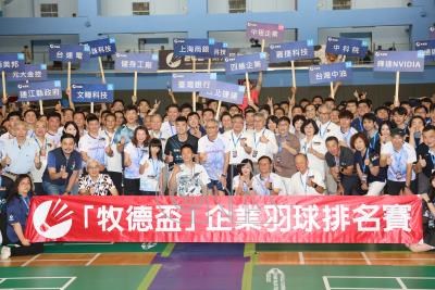 第9屆牧德盃企業羽球排名賽17日在台北體育館登場,巴黎奧運羽球男雙金牌「麟洋配」王齊麟(2排左6)、李洋(前排左5)出席並合影。