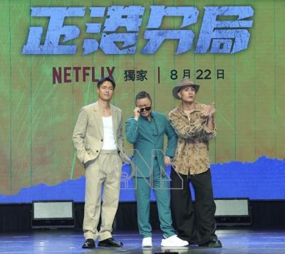 電影「關於我和鬼變成家人的那件事」衍生影集「正港分局」22日將上架串流平台,歌手黃宣(右)飾演補教名師,綜藝節目「木曜4超玩」成員邰智源(中)擔綱成語殺人魔,藝人楊祐寧(左)則演出邰智源年輕時的角色,20日一同在台北出席上線記者會。