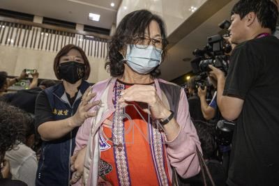 檢廉持續偵辦京華城容積案,前台北市副市長彭振聲謝姓妻子(中)以證人身分被北檢約談,晚間踏入台北地檢署接受複訊。中央社記者鄭清元攝 113年8月30日