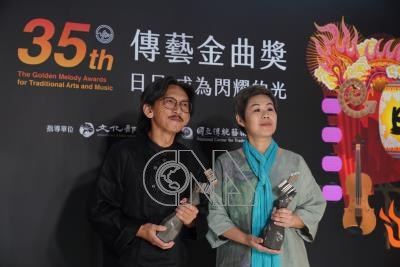 第35屆傳藝金曲獎頒獎典禮31日晚間在台灣戲曲中心圓滿落幕,本屆評審團獎由窮劇場與江之翠劇場共創的「感謝公主」拿下,窮劇場編導高俊耀(左)、江之翠劇場團長魏美慧(右)領獎後合影。