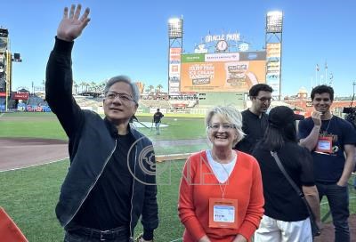 MLB巨人3日舉辦台灣之夜,黃仁勳傍晚穿著黑皮衣和夫人Lori Huang一同現身。