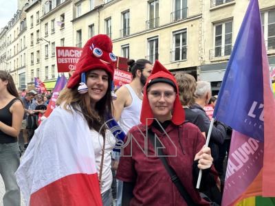 遊行參與者艾比蓋爾(右)和朋友一起戴著巴黎奧運吉祥物弗里吉的帽子上街,反對馬克宏「硬來」。她認為法國民主正大開倒車,不能接受國會改選投票結果不被尊重。
