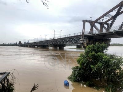 紅河流經河內市段水位持續上升,已達9.5公尺的一級警戒範圍,10日下午3時起,橫跨紅河的龍邊橋(圖)已全面禁止車輛通行。