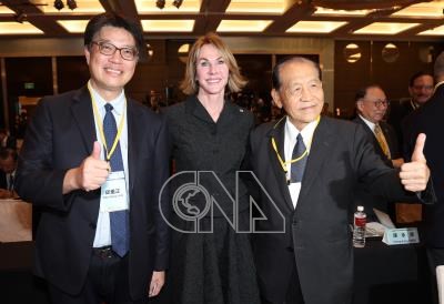國防安全研究院12日在台北君悅酒店舉行「2024台北安全對話」,聚焦中國對全球威脅及台海安全,國防院董事長霍守業(前右)、前美國駐聯合國大使克拉夫特(Kelly Craft,另譯:克拉芙特)(前中)與陸委會主委邱垂正(前左)等人合影。