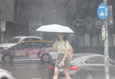 台北市14日天氣不穩定,接近中午時突然下起一陣大雨,中正區雨勢滂沱,民眾撐傘擋雨。