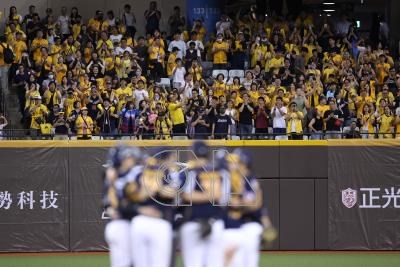 中華職棒中信兄弟隊16日繼續作客台北大巨蛋交手味全龍隊,終場兄弟以2比0奪勝,場邊兄弟球迷開心歡呼,為選手應援打氣。