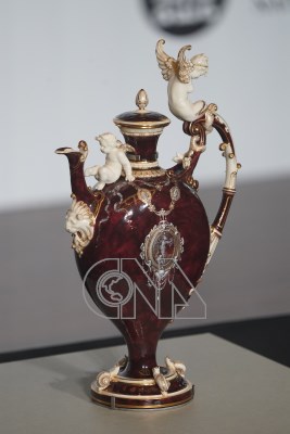國立故宮博物院攜手巴黎裝飾藝術博物館與梵克雅寶(Van Cleef & Arpels),19日在台北舉行「大美不言」特展開箱記者會,現場展示巴黎裝飾藝術博物館典藏的「布洛瓦帶蓋長頸壺」。
