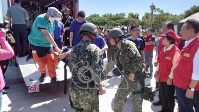 921國家防災日大規模震災救災動員演練移師嘉義縣舉辦,內政部長劉世芳(右2)19日在嘉義縣長翁章梁(右)陪同下,到故宮南院北側停車場視察預演情況。
