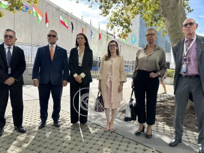 友邦駐聯合國常任代表(左起)馬紹爾的席爾克(John Silk)、吐瓦魯的法勒傅(Tapugao Falefou)、帛琉的賽德(Ilana Seid)、瓜地馬拉的曼西亞(Carla María Rodríguez Mancia)、聖文森的金恩(Inga Rhonda King)、貝里斯的傅勒(Carlos Fuller)前往祕書長辦公室遞函後,在聯合國總部外合影。