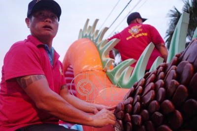 屏東東港迎王平安祭將至,期間限定地景一一出現,在大總理壇今年設有雙龍雙鳳,其中雙龍龍鱗以烏魚子組成,參與製作的陳姓師傅25日表示,4名師傅從上午7時開始打造龍身,得挑選外觀完整的烏魚子一片一片釘上去,預計半夜才能完工。