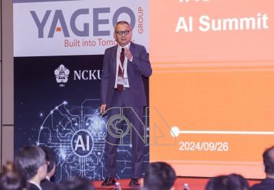 被動元件大廠國巨集團26日下午在台北舉辦AI高峰論壇,國巨董事長陳泰銘(中)出席演講。他也宣示,未來國巨在人工智慧(AI)所有應用領域,絕對不會缺席。