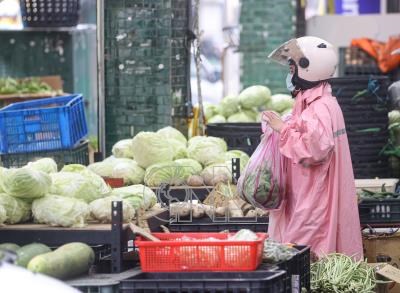 颱風山陀兒來襲,全台3日停班停課。有民眾3日上午穿著雨衣來到新北市新店區傳統市場買菜,做好防颱準備。
