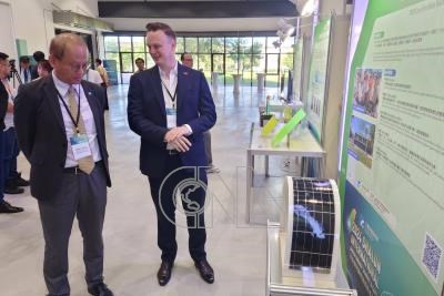 工業技術研究院7日在台南沙崙綠能科技示範場域舉辦綠能國際論壇暨成果展,綠能與環境研究所長王漢英(前左)向與會者介紹研發成果。