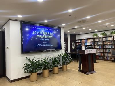 中國人民大學重陽金融研究院主辦的「2024年美國大選與中美關係前景」座談會8日在北京人民大學舉行。圖為人大國關學院副院長金燦榮講述中美關係議題。