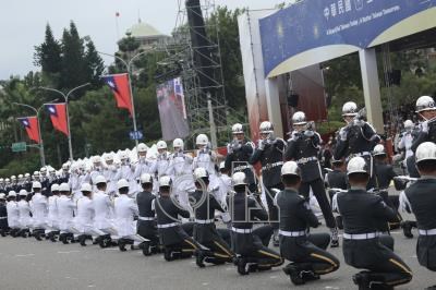 中華民國中樞暨各界慶祝113年國慶大會10日在總統府前廣場舉行,國防部聯合樂隊暨三軍儀隊帶來暖場演出,展現精準走位技巧。