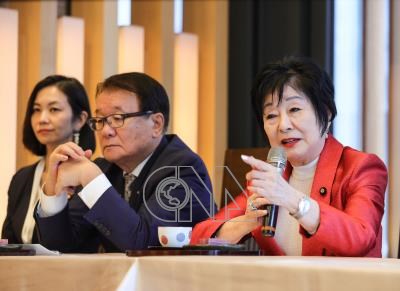 日本國會跨黨派友台團體「日華議員懇談會」籌組「中華民國國慶日本國會議員祝賀團」訪台,由在日本政壇輩份高的參議員山東昭子(右)擔任團長,10日下午訪團在台北出席記者會,山東昭子會中回應媒體提問。