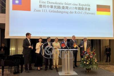 駐德國代表處舉辦中華民國113年國慶酒會,德國友台政要瑪格瓦斯(左四)、威爾許(右三)、包瑞翰(右一)、法伯(左一)、穆勒(右二),與駐德代表謝志偉伉儷(左二左三)舉杯和與會者共慶。