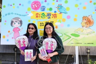 國父紀念館響應「台灣女孩日」,12日除舉辦「查某囡仔真讚」系列活動,也以漫畫小冊「進擊吧!花漾正義」推廣性別平權,漫畫作者顏惟萱(右)與當年爭取職場性別平權的國父紀念館服務員王蘭詩(左)合影留念。