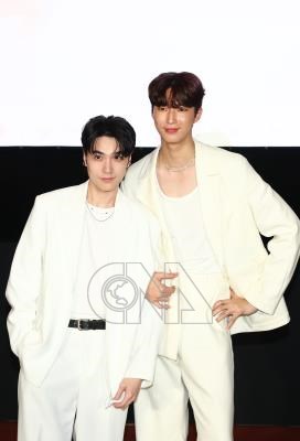 BL劇「看見愛」宣傳記者會15日下午在台北光點華山電影館舉行,劇中組成CP的演員金雲(右)、林宇(左)一同以白色系西裝出席。