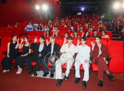 BL劇「看見愛」15日在光點華山電影館舉行宣傳記者會,主要演員金雲(前右3)、林宇(前右2)、陳柏文(前右1)、艾雨帆(前左起)、李悠、林詠傑、林家佑一同出席與粉絲相見歡。