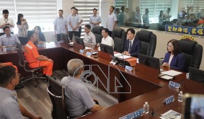 因應中國軍演,陸、海、空軍與海巡都在最快時間應處、完成各項任務,總統賴清德(後右2)18日前往新北市淡水區海巡署艦隊分署勗勉,致詞表示他要代表全體國人感謝國軍與海巡全力捍衛國家安全。後右為海委會主委管碧玲。