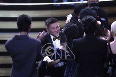 第59屆電視金鐘獎18日晚間在台北流行音樂中心舉行節目類頒獎典禮,資深藝人澎恰恰(中)等人以「超級夜總會」拿下綜藝節目主持人獎,登台領獎前許多人向澎恰恰道賀。