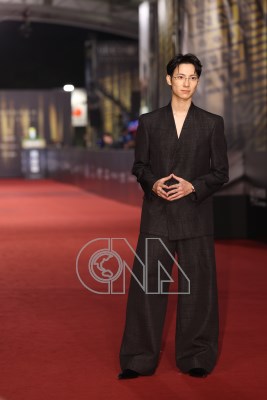 第59屆電視金鐘獎戲劇類星光大道19日傍晚在台北流行音樂中心展開,演員彭千祐(圖)以黑色西裝搭配超寬寬褲與無框眼鏡亮相紅毯,開心留影。