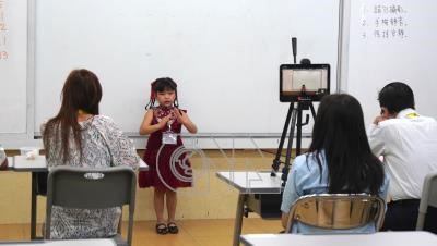 雅加達台灣學校舉辦首屆「雅華盃」華語文競賽,吸引逾300人報名。圖為小學生參加詩詞朗誦比賽。