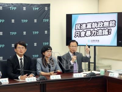 立法院民眾黨團5日上午舉行「總預算案卡關有解方?民進黨別再自己卡自己」記者會,立委張啓楷(右)表示,如果民進黨不依法追加預算,民眾黨團將反對總預算付委到底。圖左起為黨團總召黃國昌、幹事長麥玉珍。