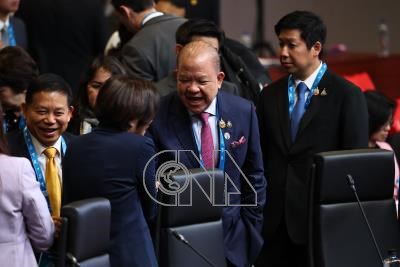 2024亞太經濟合作會議APEC年會在秘魯利馬登場,當地時間14日上午APEC雙部長會議開幕,行政院政務委員楊珍妮(前短髮者)與泰國商務部部長披猜(Pichai Naripthaphan)(紅領帶者)互動。