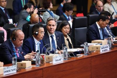 2024亞太經濟合作會議APEC年會在秘魯利馬登場,當地時間14日上午APEC雙部長會議開幕,美國國務卿布林肯(Antony Blinken)(左3)、美國貿易代表戴琪(Katherine Chi Tai)(左4)出席。