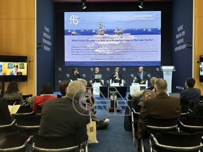 法國國際關係研究所的年度研討會11月14日下午舉行講座,聚焦印太同盟對抗中國威脅,由學者麥丹(視訊)、Adrian Ang(左2)、巴鍾(左1)、賴怡忠(右2)開講,智庫研究員席曼(John Seaman)主持。