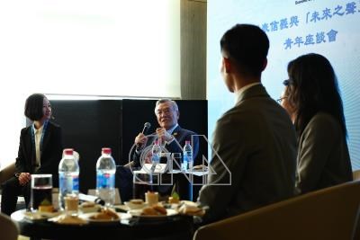 「未來之聲」青年座談會於當地時間14日在秘魯利馬登場,APEC台灣領袖代表林信義(後左2)仔細聆聽青年領袖提問,並分享自身經驗。
