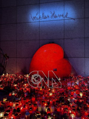 捷克前總統哈維爾紅心紀念雕塑 擺滿蠟燭