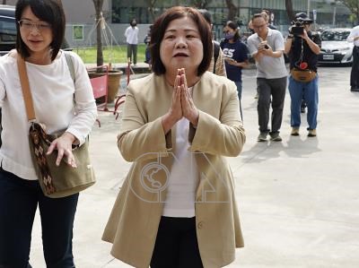 勞動部北分署公務員輕生案延燒,前勞動部長許銘春(前左2)21日上午受訪說明,訪問結束後,許銘春雙手合十向媒體致意。