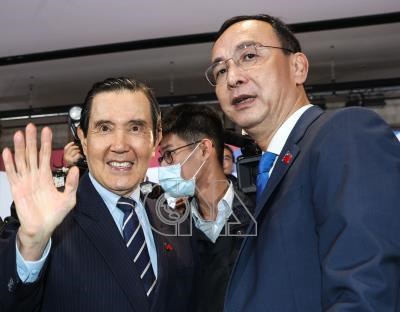 國民黨全代會暨130週年黨慶24日在桃園登場,前總統馬英九(左)出席,向黨員揮手致意。右為國民黨主席朱立倫。