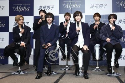 日本偶像男團「浪花男子」28日下午在台北晶華酒店舉行訪台記者會,團員高橋恭平(前左起)、大西流星、道枝駿佑、西畑大吾、長尾謙杜(後左起)、大橋和也、藤原丈一郎在記者會上暢談訪台心得。